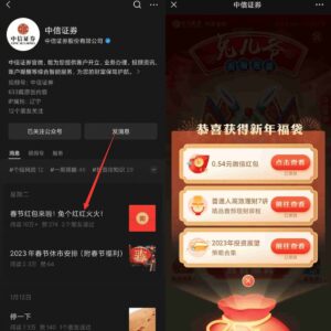 微信公众号”中信证券“推出春节活动”春节红包来啦!兔个红红火火!“免费领福袋得微信现金红包~ 领取教程:微信搜索公众号”中信证券“-消息第一个”春节红包来啦!兔个红红火火!“-进入活动...